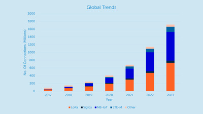 The website Statista.com (GE) has analyzed the deployment of LPWAN technologies until 2023. In the next 2 years, the number of IoT devices will double, bringing approximately 1.7 billion devices online. LoRaWan and NB-IoT networks are predicted to double in number of devices, while Sigfox will grow somewhat less. This is probably not surprising when you consider the power behind the NB-IoT and LoRaWan systems.