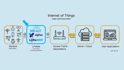We normally think of networks as something where the goal is to send as much data as quickly as possible. This works fine when there is plenty of power available. But an IoT device doesn't need to be able to send/receive a lot of data, as is needed when streaming a movie, for example, it just needs to be able to send/receive small data packets over several years. And IoT devices do not have unlimited power, they usually run on batteries and are placed in places where you can't just pull a power cord or easily change a battery. That's why Low Power Wide-Area Networks (LPWAN) have been developed. These are radio technologies that use very little power and can send a small amount of data over long distances (much further than your cell phone). The three main LPWAN technologies are Sigfox, LoRaWAN and NB-IoT.