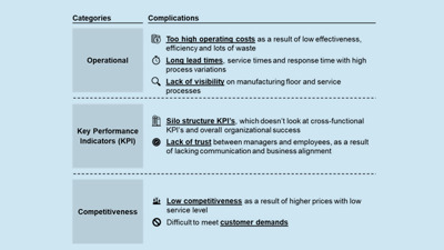 Vi har opstillet tre hovedkategorier af komplikationer, som beskriver nogle af ovenstående problemer. Den første kategori er driftsmæssige komplikationer, som ofte kan ses i høje driftsomkostninger, lange leveringstider og manglende synlighed. Den næste kategori er Key Performance Indicators (KPI), som ofte kan ses i en organisation med silostrukturerede KPI'er og tillidsproblemer samt spændinger mellem ledere og medarbejdere. Den sidste kategori er konkurrenceevne, da virksomheder, der ikke fokuserer på deres processer, har en stor chance for at opleve lav konkurrenceevne og vanskeligheder med at opfylde kundernes krav.